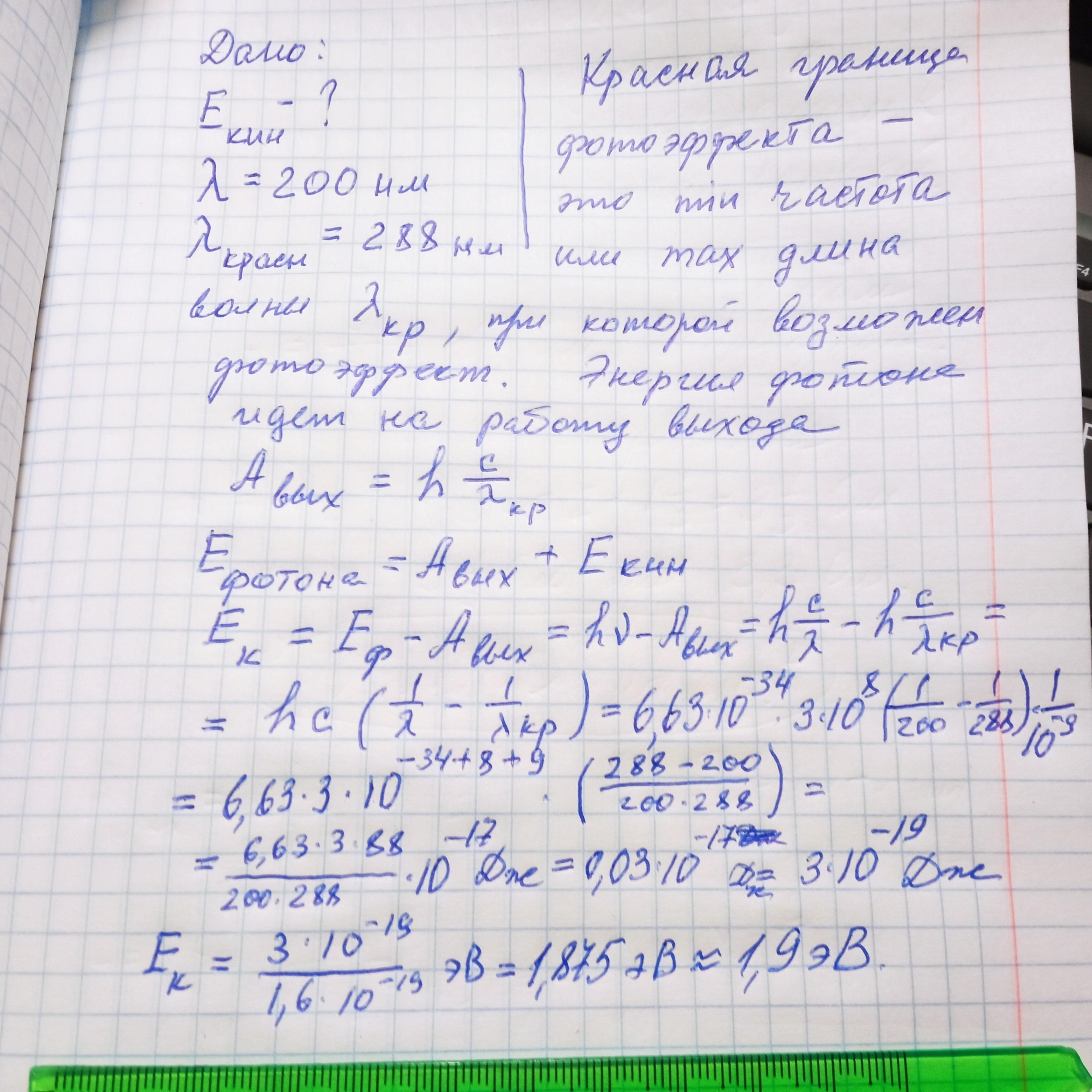 Яку максимальну кінетичну енергію мають електрони при опроміненні заліза світлом з довжиною хвилі 200 нм? Червона межа фотоефекту для заліза 288 нм