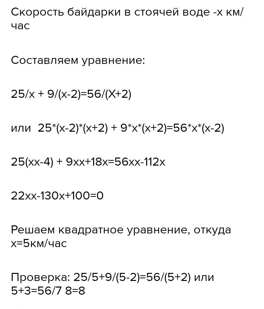Турист проплыл на байдарке 25 км по озеру и 9 км против течения реки за столько же времени, за сколько он проплыл бы по течению той же реки 45 км. Найдите скорость байдарки в стоячй воде, если скорость течения реки равно 2 км/ч.