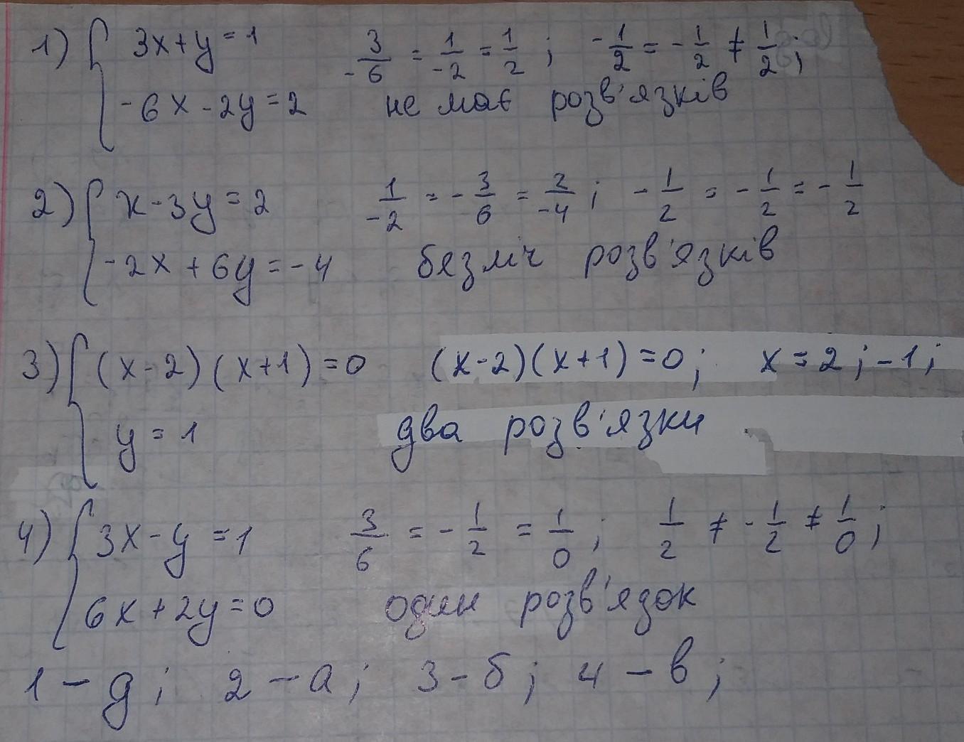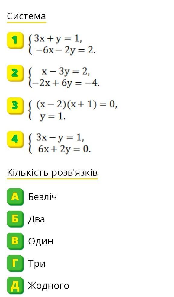 Установіть відповідність між системами рівнянь (1 – 4) і кількістю їхніх розв'язкiв Сссррроооччччннноо ппппжжжж