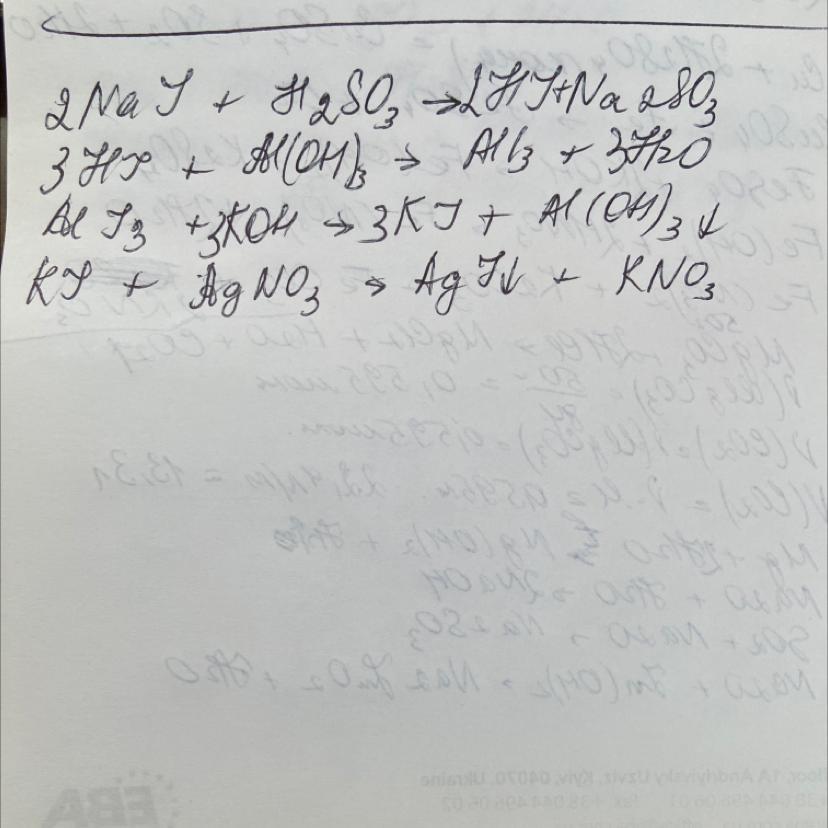 Складіть молекулярні рівняння реакцій, за допомогою яких можна здiйснити перетворення за такою схемою: натрій йодид - Йодоводень - алюміній йодид - калiй йодид - калій нітрат.