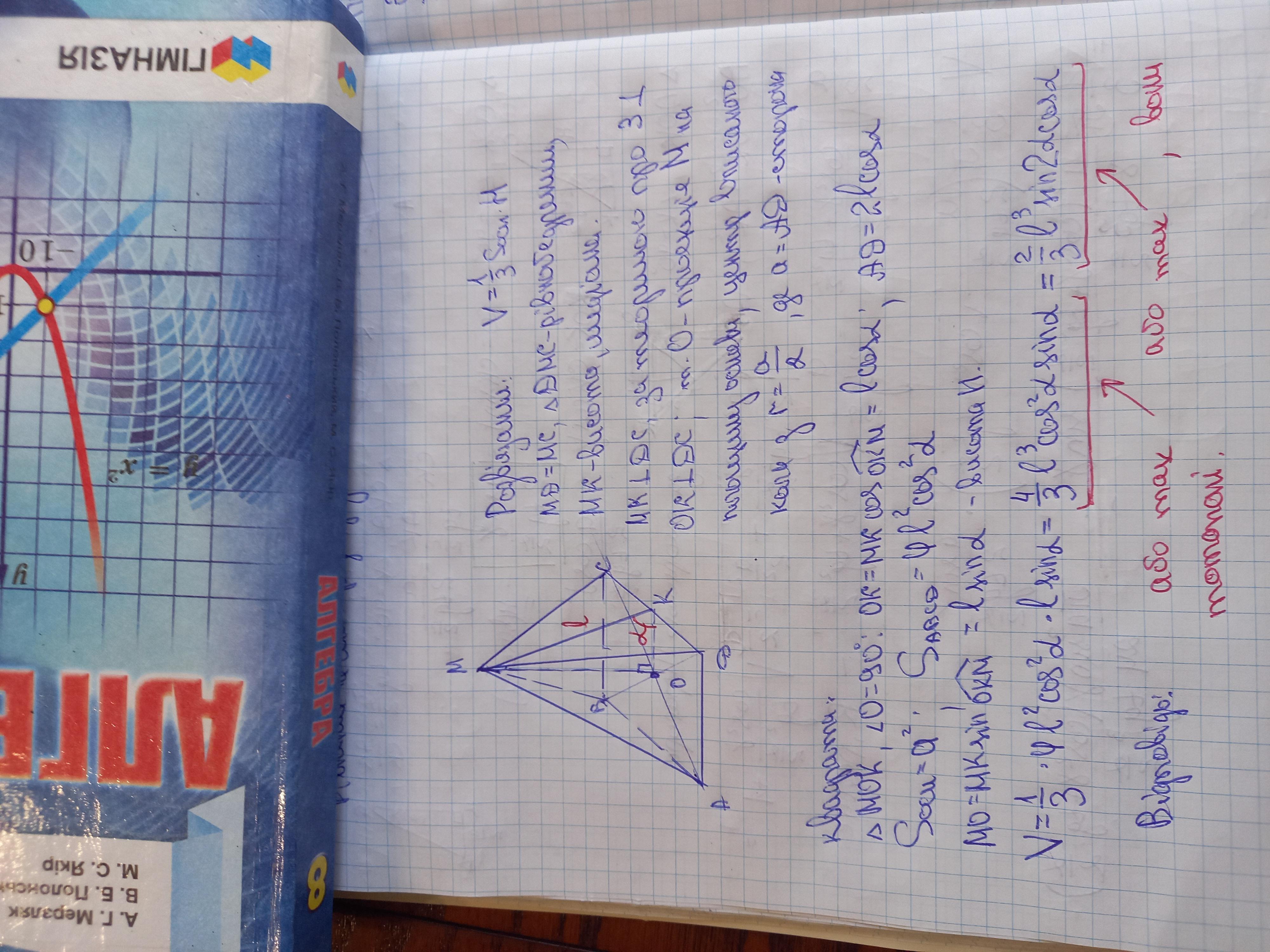 апофема правильної чотирикутної піраміди дорівнює l і утворює з площиною основи піраміди кут а .знайдіть обєм піраміди