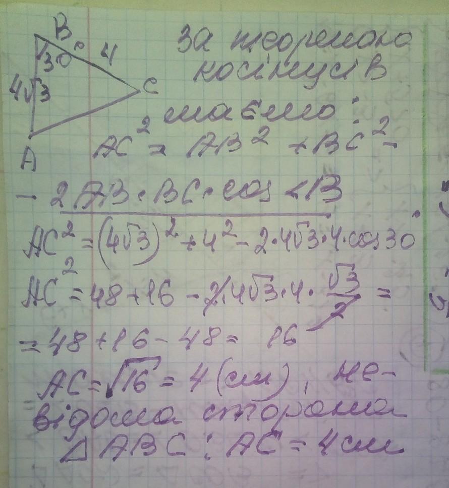 дві сторони трикутника дорівнюють 4 см і 4√3 см ф куд між ними - 30 . Знайти невідому сторону трикутника.