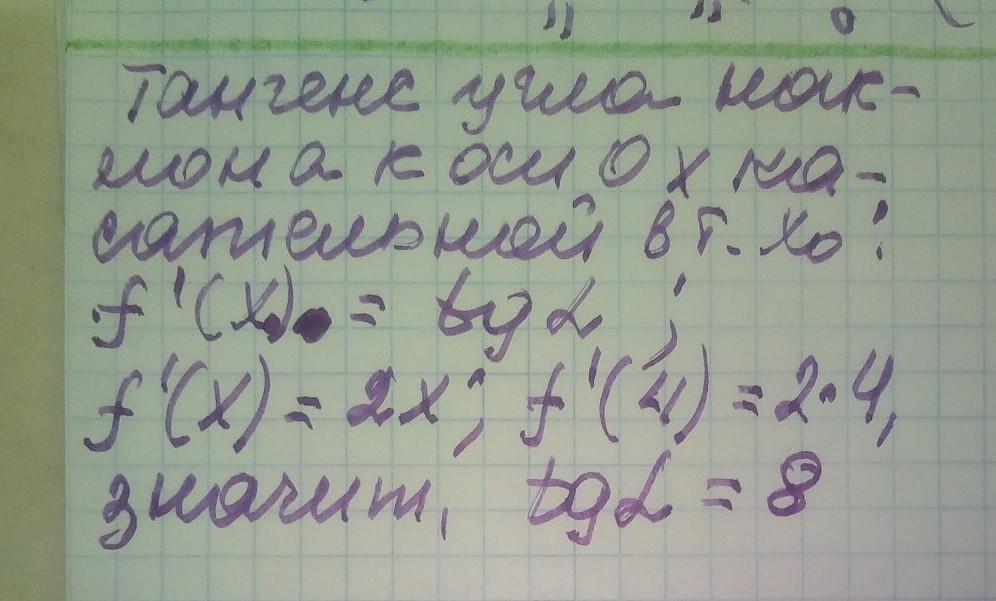 Найдите тангенс угла наклона к оси абсцисс касательной, проведенной к графику функции f(x) = x² в точке хо=4.