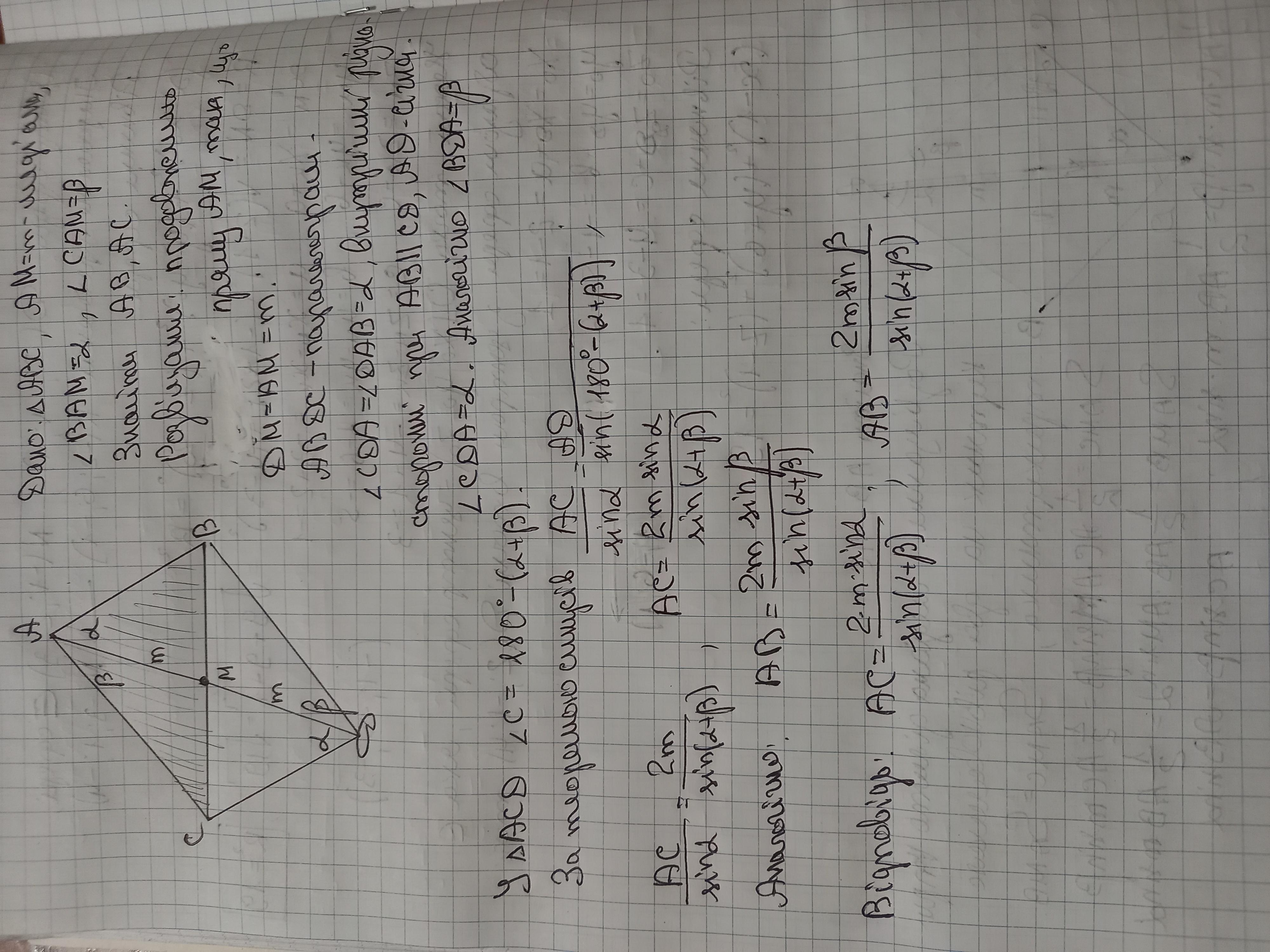 Медіана AM трикутника ABC дорівнює m і утворює зі сторо-