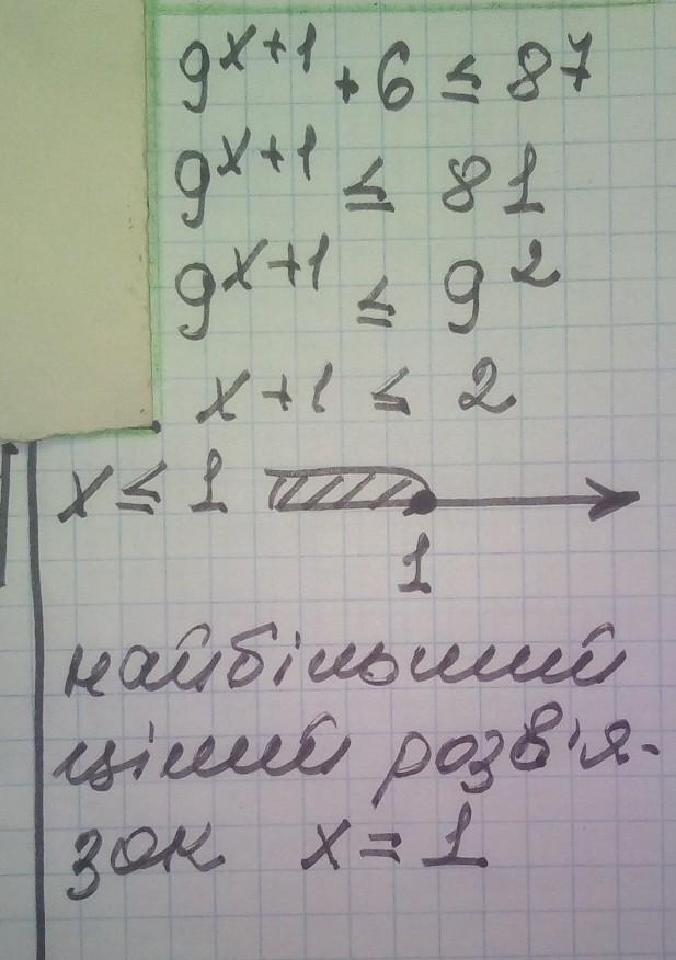 2. Знайдіть найбільший цілий розв'язок нерівності 9^x+1 +6 ≤ 87