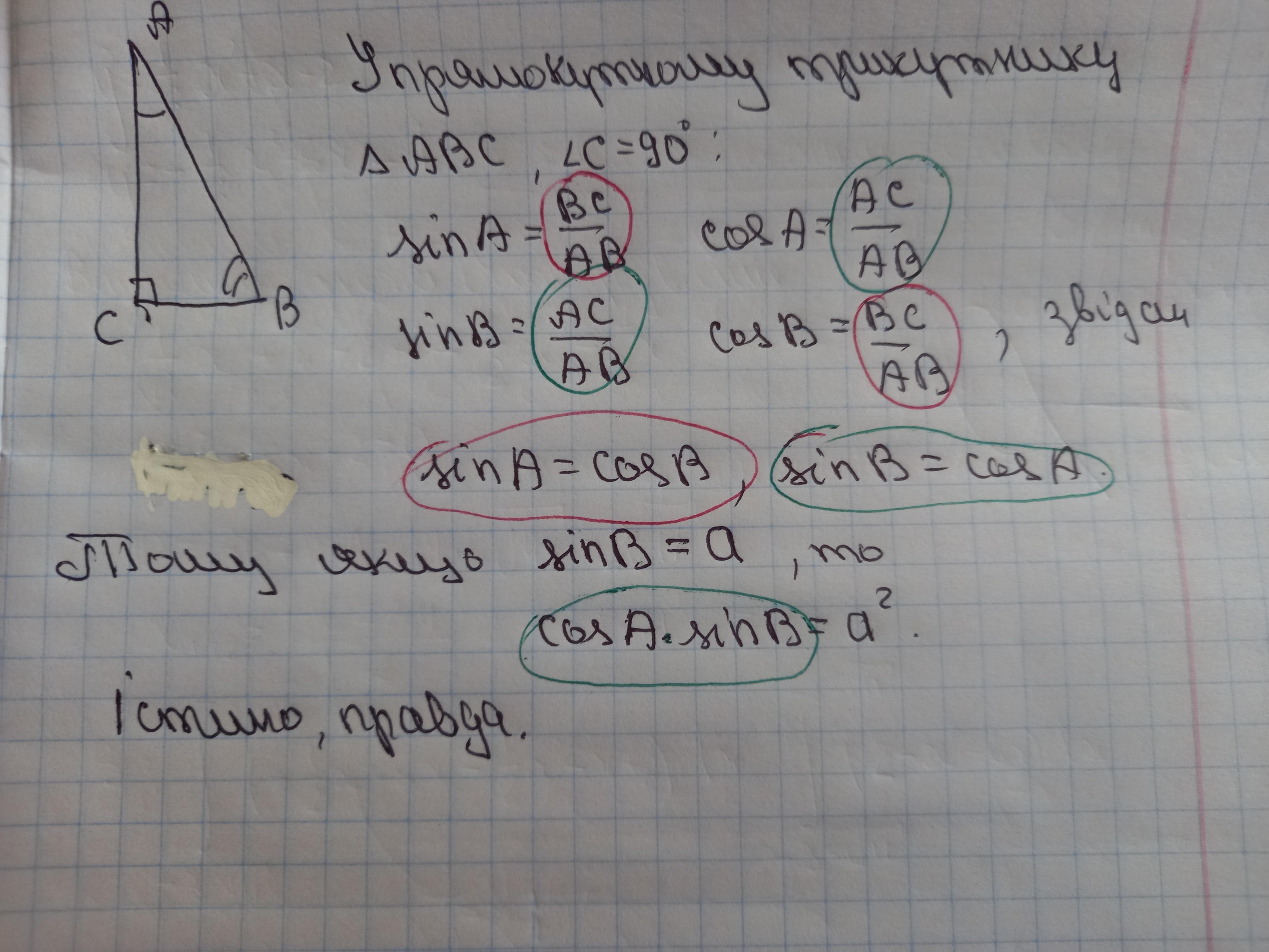 якщо у прямокутному трикутнику ABC C=90 sinB=a то cosA *sinB =a в 2 степені