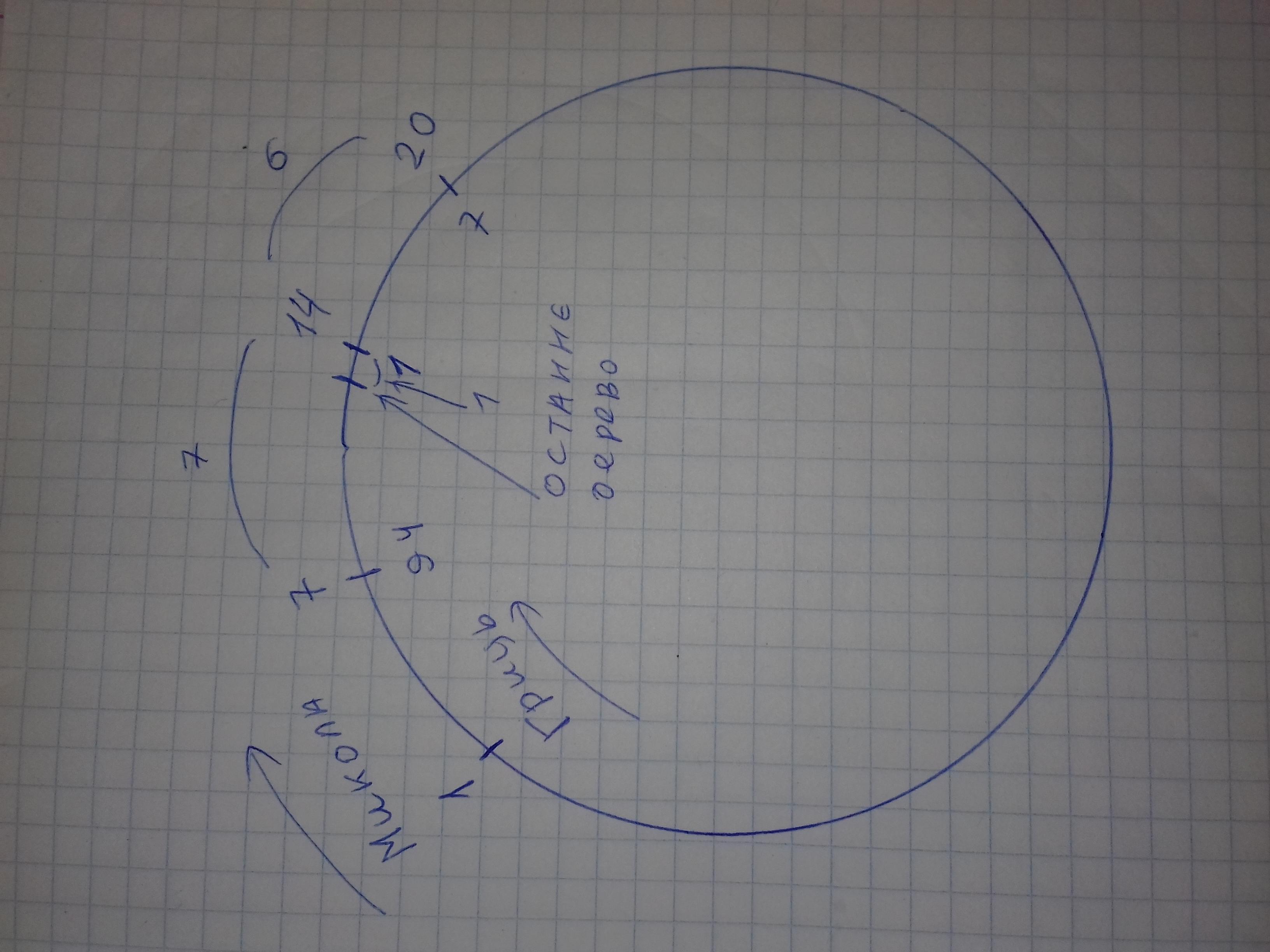 Якщо те дерево яке у Миколи було 20-м, у Гриця було 7-м., то те дерево яке було першим у Гриця, у Миколи було 14.