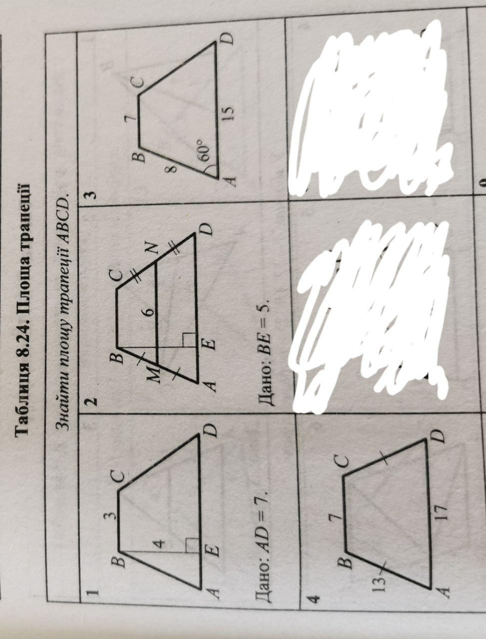 4. Опускам две высоты, получатеся квадрат и 2 трегуольника. Оснавние делится на 5, 7 и 5. Из пифогора находим высоту 5^2+12^2=13^2, h=12. Площадь (17+7)*12/2