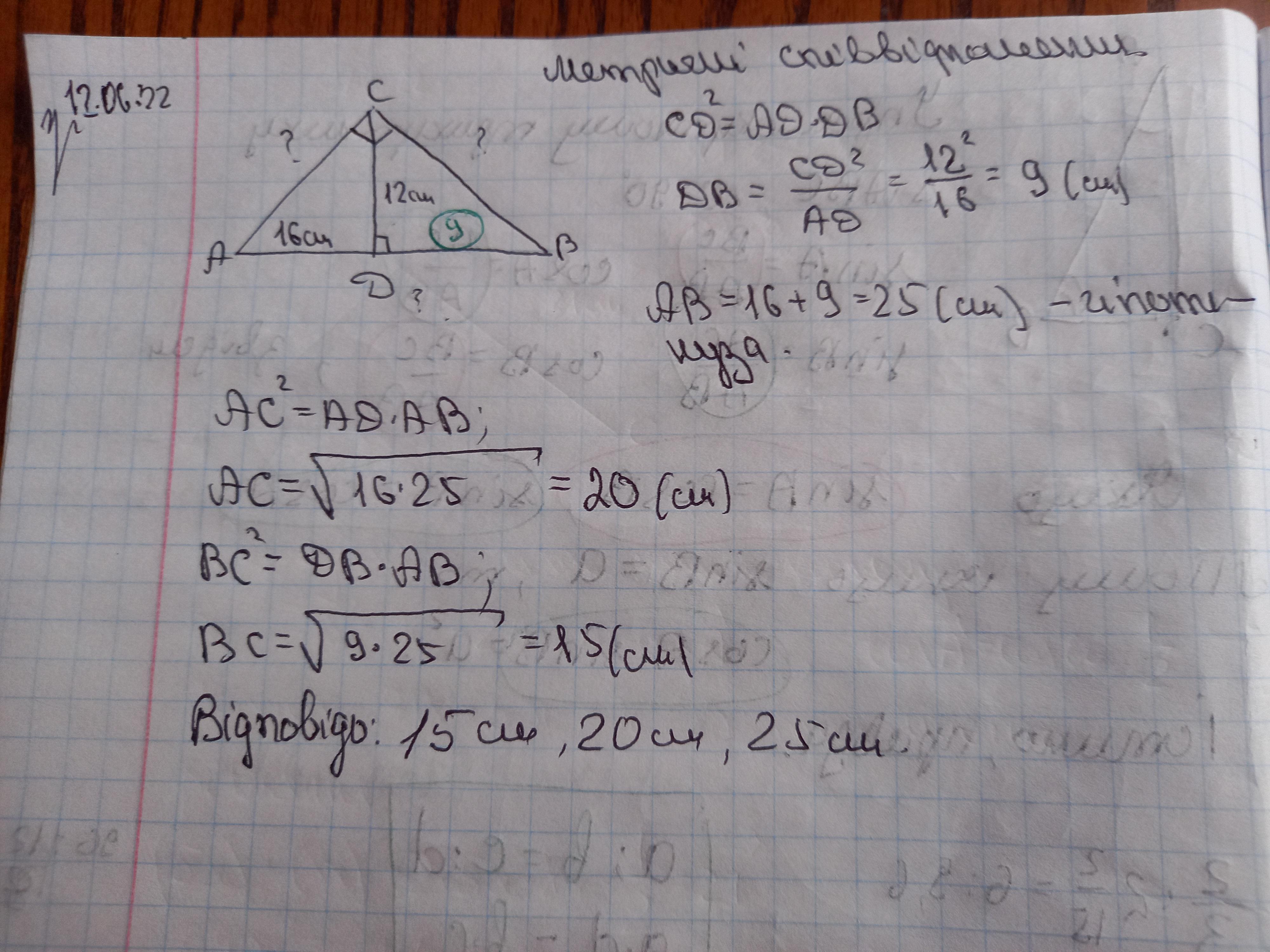 Виконати: У прямокутному трикутнику знайдіть невідомі СТОРОНИ, якщо: Висота, проведена до гіпотенузи, дорівнює 12 см, а проекція одного з катетів на гіпотенузу має довжину 16 см.