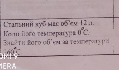 Стильний куб має об'єм 12 літрів. Коли його температура 0 С. Знайди його об'єм за температури 260 С.