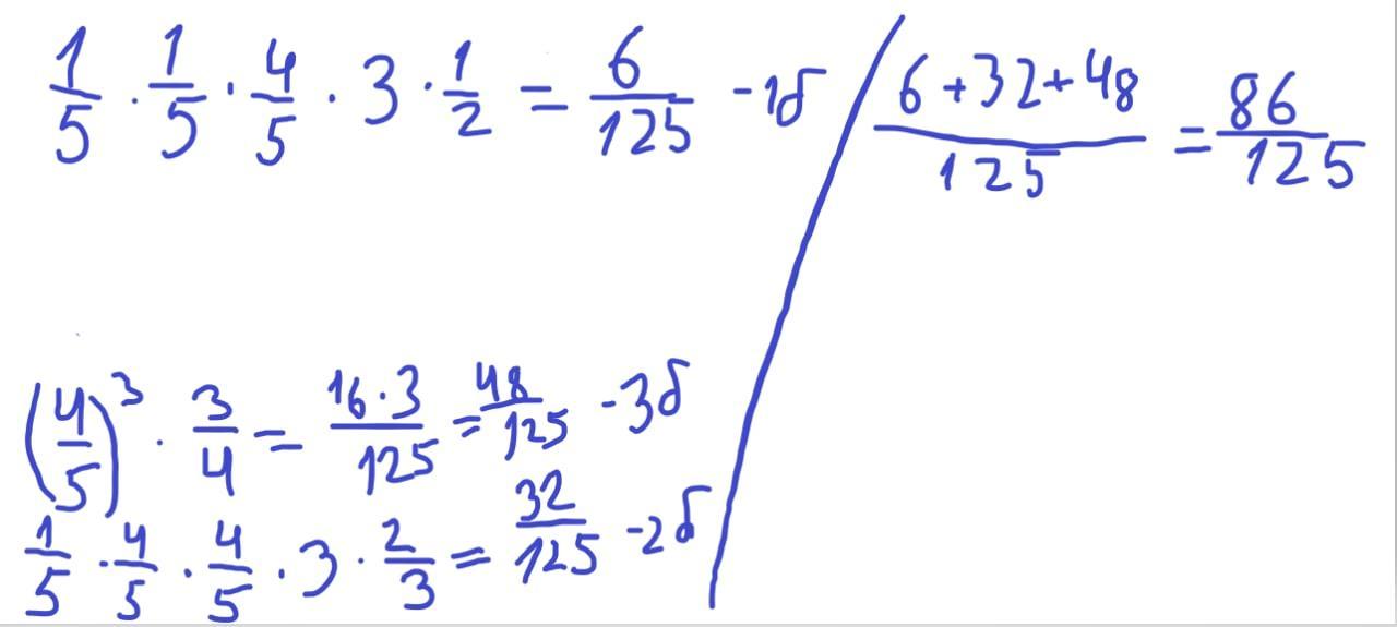 Пошаговое объяснение:сложим вероятности, когда мост разрушен одной бомбой 6/125, двумя 48/125, тремя 32/125. По 3 случая есть при попадании двух бомб, так как не попасть может одна из трёх бомб и при попадании одной бомбы тоже 3 равновероятных случая, когда попасть может либо первая, либо вторая, либо третья.