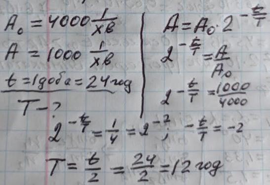 Лічильник зареєстрував за 1 хв 4000 частинок, що виникали під час розпаду радіоактивного ізотопу натрію, а через добу тільки 1000 розпадів за 1 хв. Визначте період напіврозпаду ізотопу
