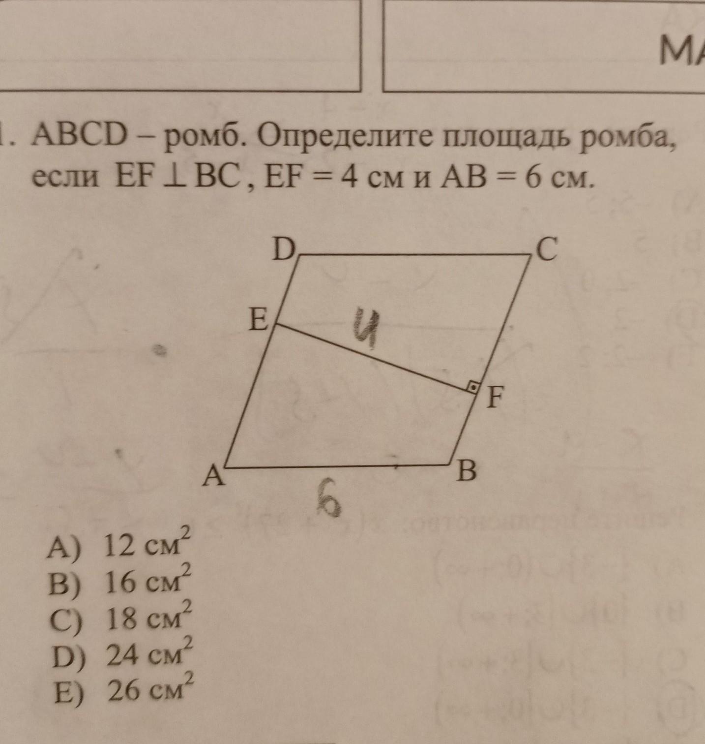 11. ABCD - ромб. Определите площадь ромба, если EF (знак перпендикуляра) BC, EF = 4 см и AB = 6 см.