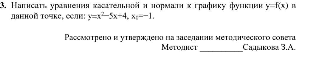 Написать уравнение касательной и нормали к графику функции y=f(x) в данной точке, если: y=x²-5x+4, Xo=-1