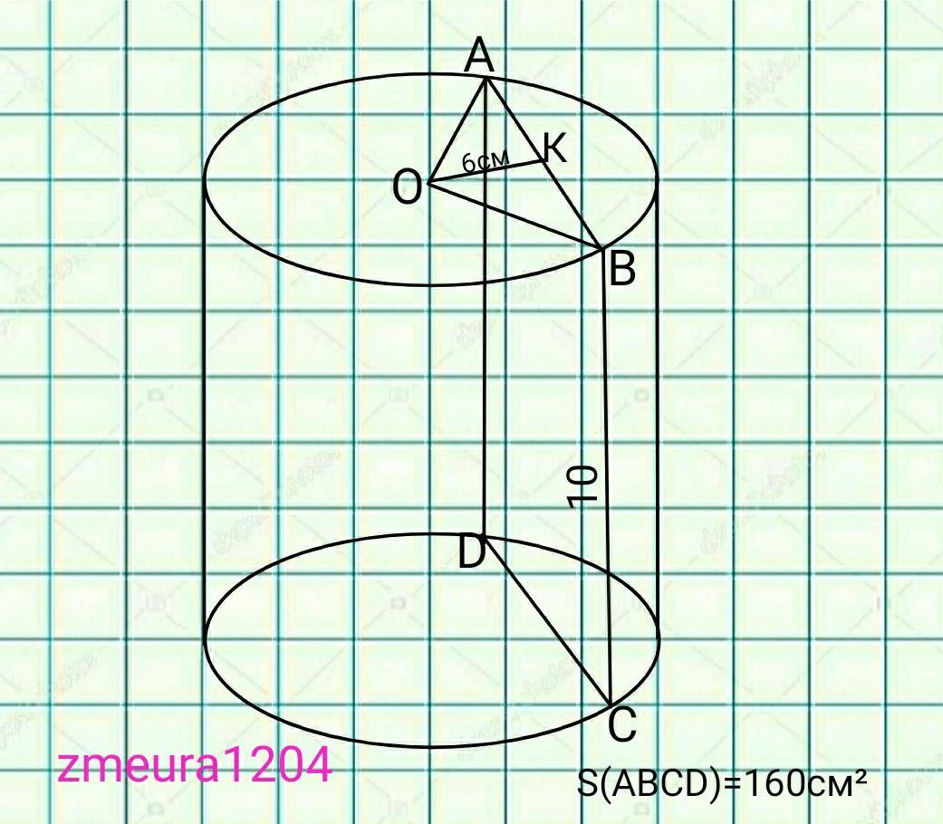 ОК- висота, медіана рівнобедреного трикутника ∆АОВ; АО=ОВ, радіуси циліндра.