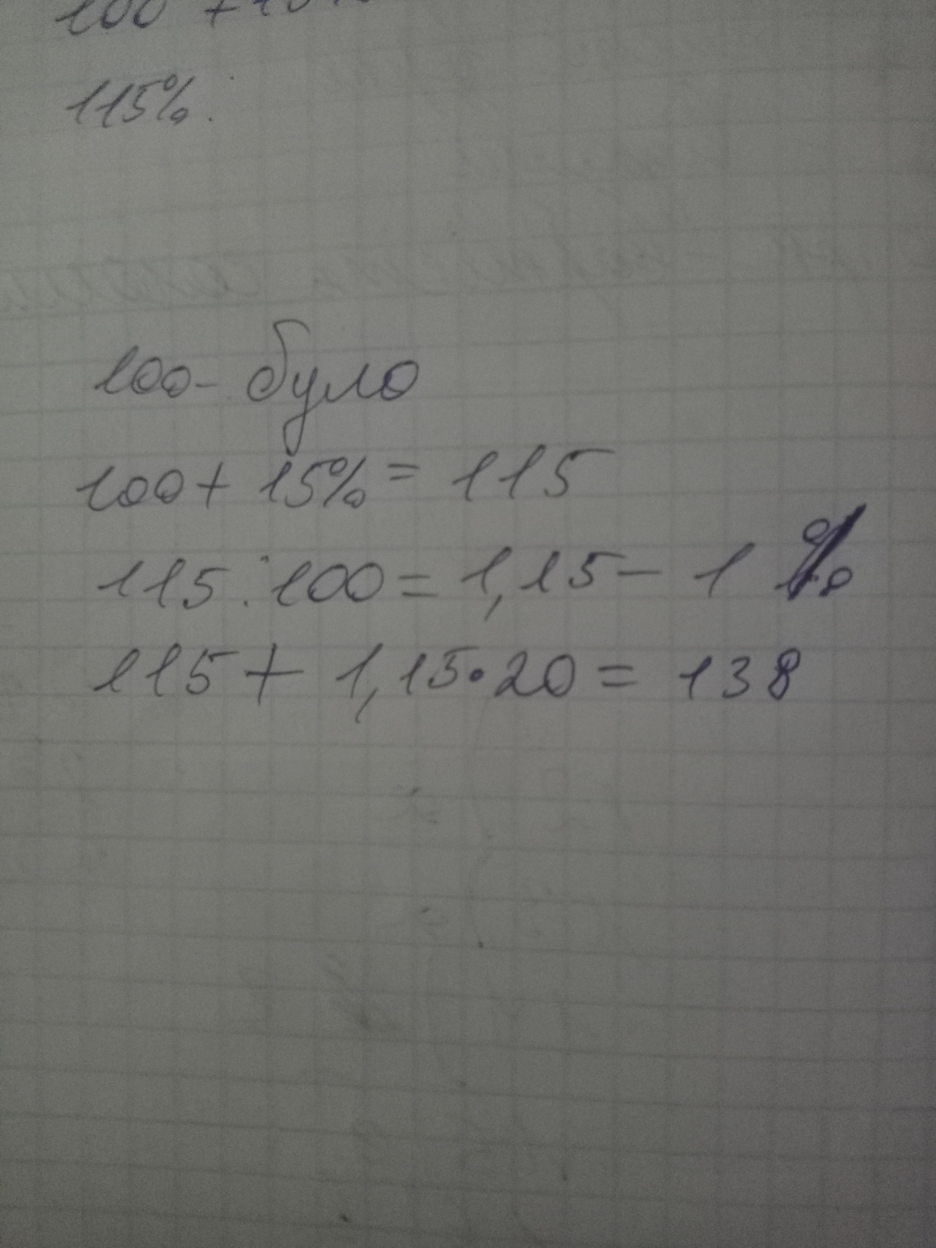 Зарплату робітнику підвищили спочатку на 15% а потім через рік ще на 20%. На скільки відсотків підвищується плата робітника в порівнянні з первісною?