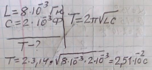 Визначити період коливального контуру, індуктивність котушки якого 8 *10 -3 Гн, а ємність 2 *10 -3 Ф?