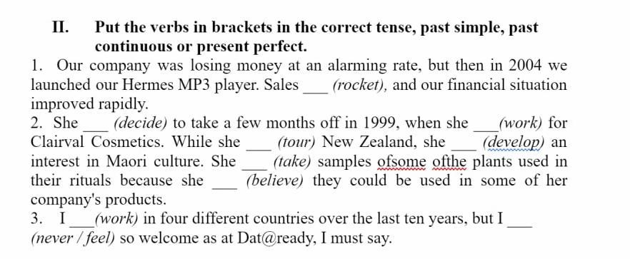 Put the verbs in brackets in the correct tense, past simple, past continuous or present perfect.
