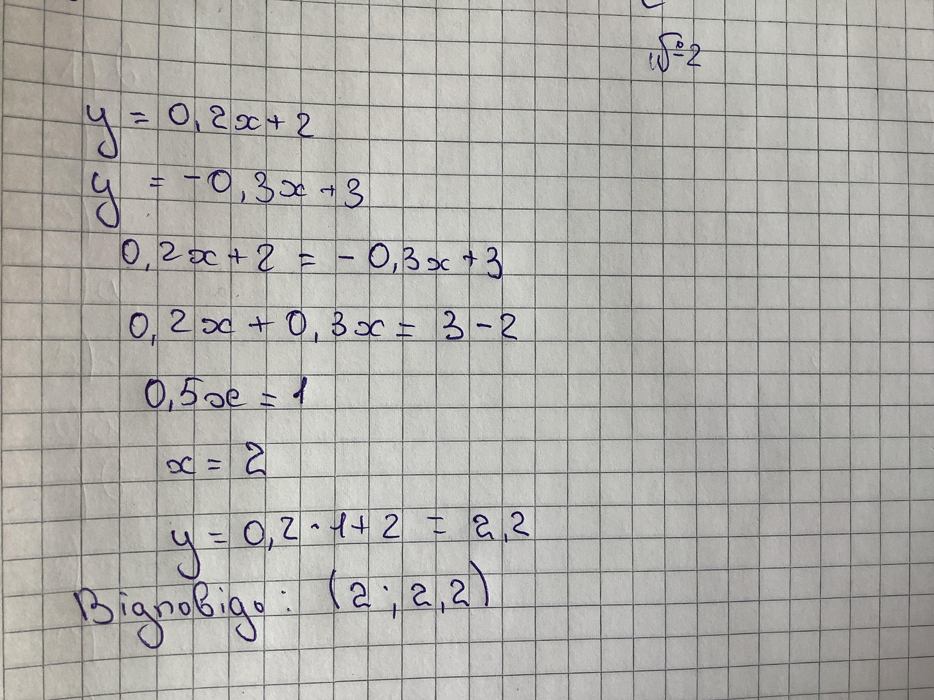 не выполняя построения найдите координаты точек пересечения графика заданной функции с осями координат у=о,2х+2 и у=-0,3х+3