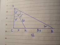 ∆ АВС, <С=90° , <В=30° , АК биссектриса. По теореме о сумме углов треугольника, второй острый угол <А=60° . И именно его биссектриса делит пополам, <САК=<КАВ=30° . Пусть в ∆АКС , сторона СК=х, тогда АК=2х по свойству угла в 30° . В ∆ АКВ, два угла <В=<КАВ=30° =>АК=КВ. Тогда катет СВ=СК+КВ и СК=18=> х+2х=18, х=6 => АК=2*6=12(см).