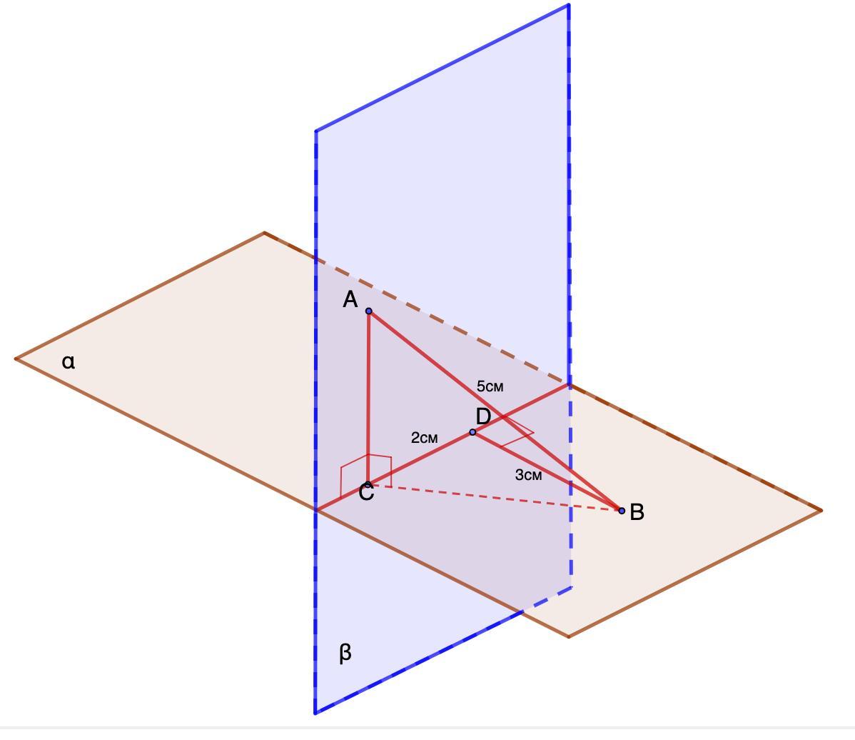 Из точек A и B, принадлежащих двум перпендикулярным плоскостям, проведены в них перпендикуляры AC и BD к линии пересечения плоскостей. Найти отрезок AC, если AB = 5 см, BD = 3 см, CD = 2 см.
