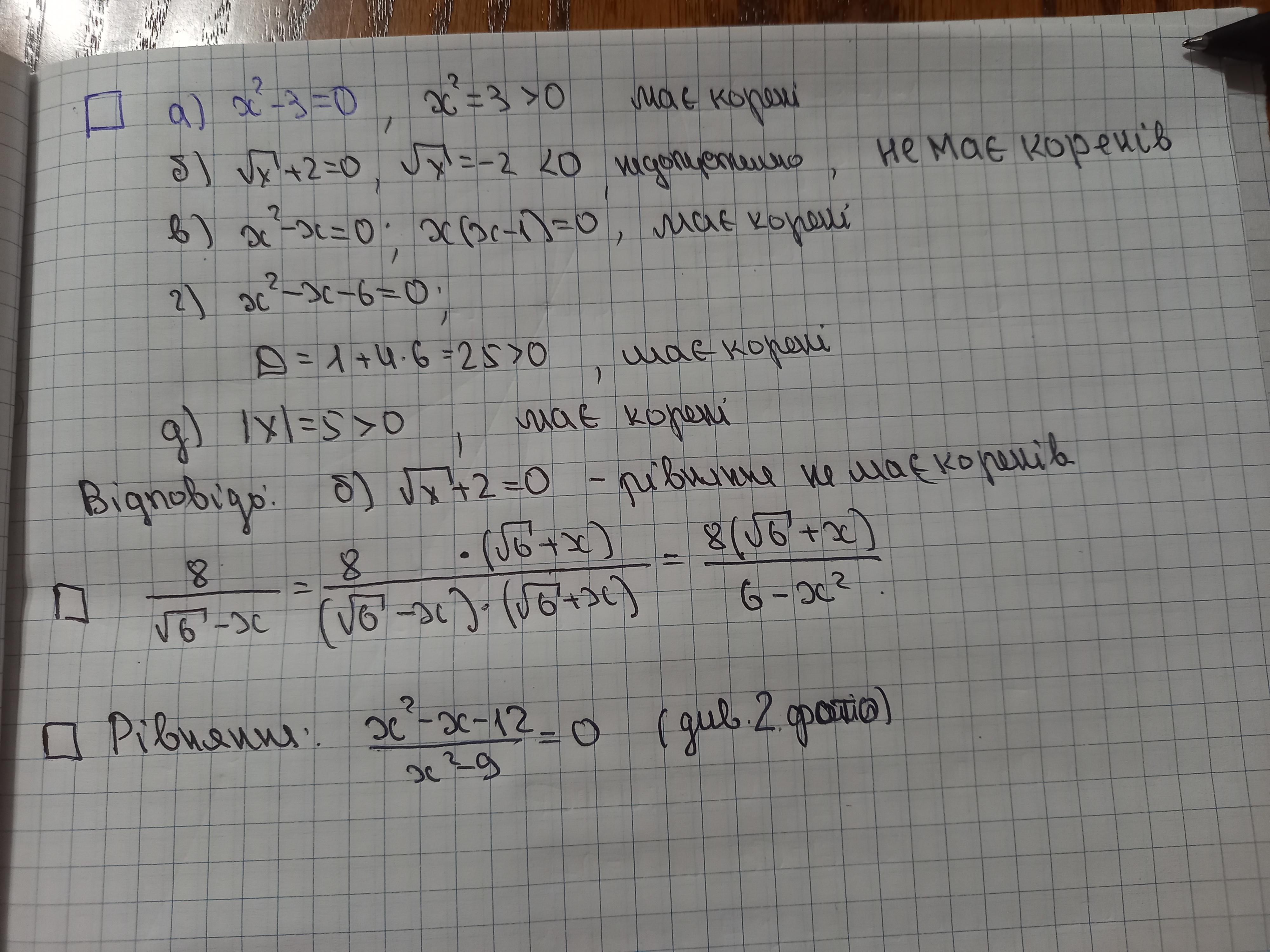 a) x² - 3 = 0; r) x² - x - 6 = 0; 6) x+2=0; д) |x| = 5. B) x² - x = 0;