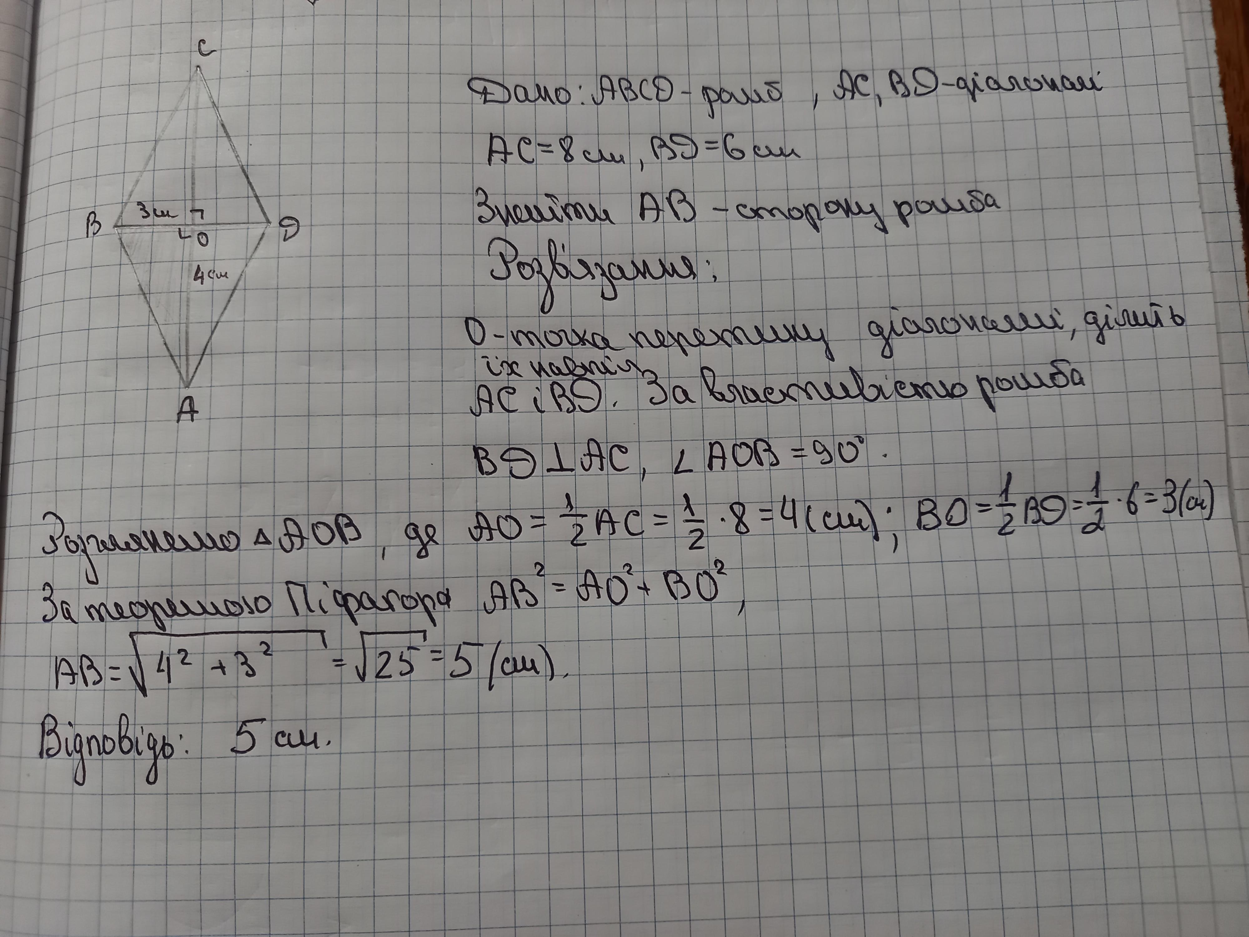 АВСД-ромб у якому АС=8см,ВС=6см.Знайдіть довжину АВ