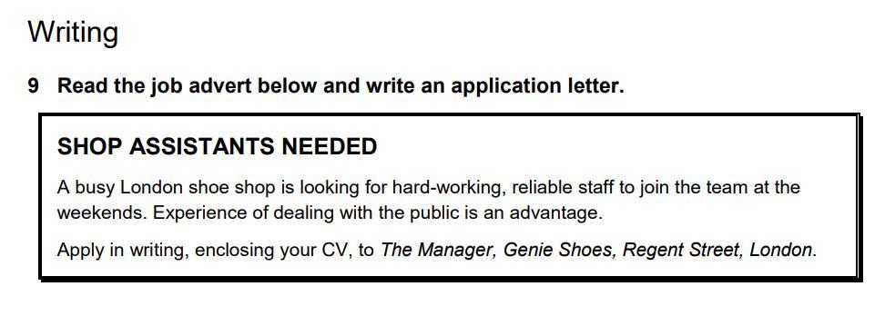 SHOP ASSISTANTS NEEDED Apply in writing, enclosing your CV, to The Manager, Genie Shoes, Regent Street, London. A busy London shoe shop is looking for hard-working, reliable staff to join the team at the weekends. Experience of dealing with the public is an advantage. 9 Read the job advert below and write an application letter.