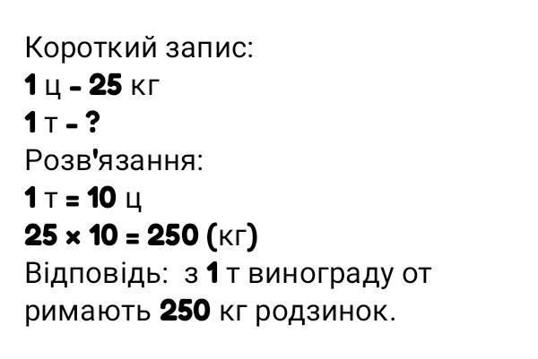 З кожного центнера винограду отримують 25 кг родзинок. Скільки кілограм родзинок отримають з 1 т винограду?