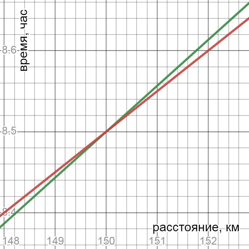 Пересечение этих графиков и есть место встречи автобуса и автомоболя (Рис. 1). На рис.2 можно точно определить координаты пересечения графиков: (150;8,5).