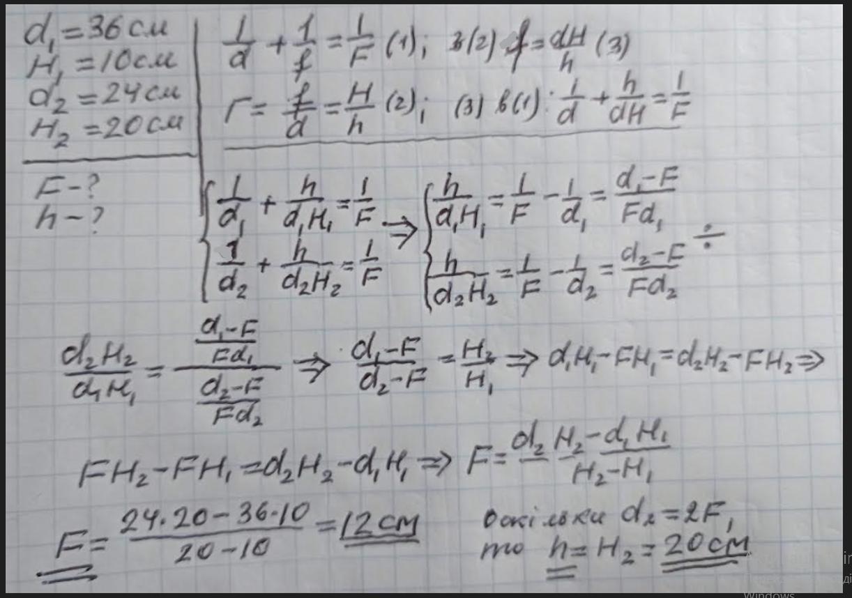 зображення 20 см. Визначте фокусну відстань лінзи та висоту предмета.