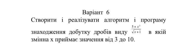 Створити і реалізувати алгоритм і програму знаходження добутку дробів виду в якій змінна x приймає значення від 3 до 10.