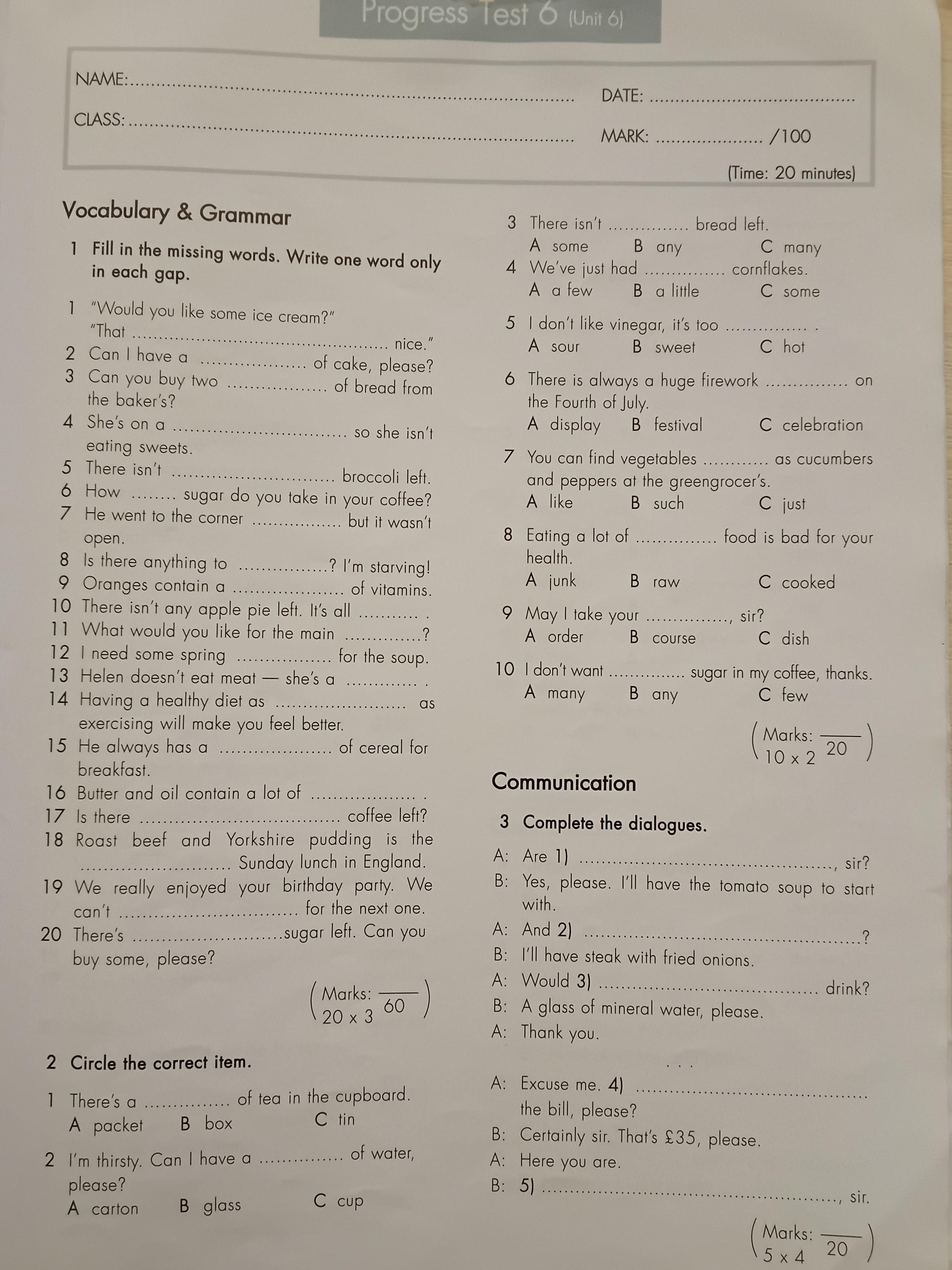 1 is 2piece 3loaves 4diet 5any 6much 7shop 8.eat 9lot 10.eaten 11course 12green 13.vegetarian 14 healthy 15plate 16fat 17any 18best/main 19 wait 20.no