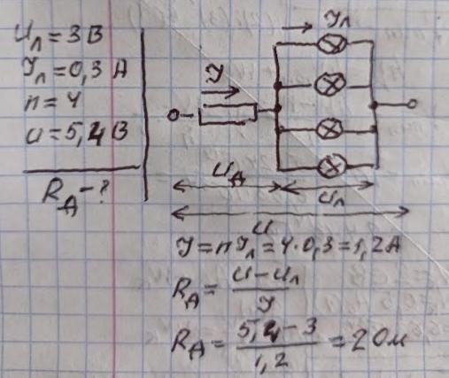 3. Задача. Чотири лампочки, розраховані на напругу 3В та силу струму 0,3А, треба включити паралельно та живити від джерела напругою 5,4В. Який додатковий опір треба включити? Як зміниться розжарювання ламп, якщо одна з них перегорить?