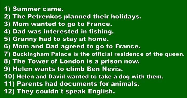 1) Summer came. 2) The Petrenkos planned their holidays. 3) Mom wanted to go to France. 4) Dad was interested in fishing. 5) Granny had to stay at home. 6) Mom and Dad agreed to go to France. 7) Buckingham Palace is the official residence of the queen. 8) The Tower of London is a prison now. 9) Helen wants to climb Ben Nevis. 10) Helen and David wanted to take a dog with them. 11) Parents had documents for animals. 12) They couldn't speak English.