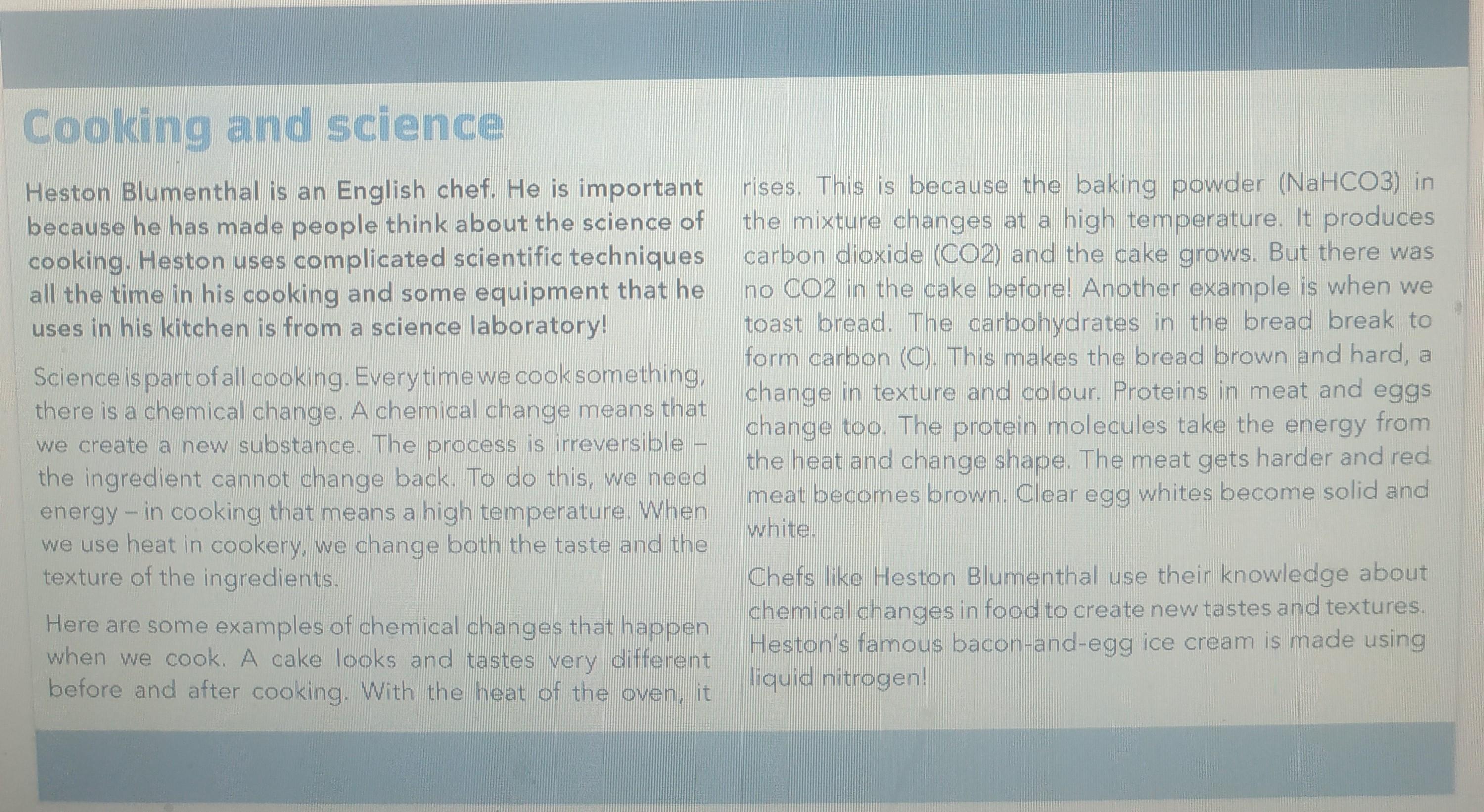 Read the article again. Answer the questions. 1 Who is Heston Blumenthal and why is he important? 2 What does 'a chemical change' mean? What happens to make a cake rise? 3 A 4 What happens when bread becomes toast? 5 What happens when we cook meat and eggs? 6 Which of Blumenthal's dishes is made using liquid nitrogen?