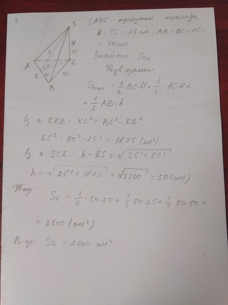 В основі піраміди лежить правильний трикутник. Висота піраміди проходить через одну з вершин і дорівнює 25 см. Сторони основи дорівнюють 50 см. Знайдіть площу бічної поверхні піраміди.