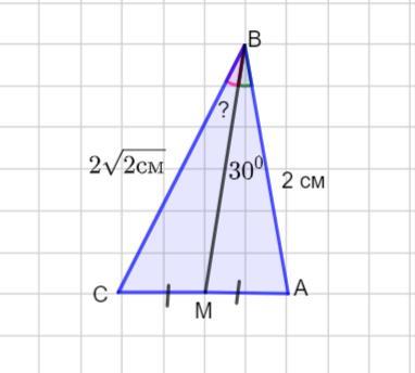 В треугольнике ВМ-медиана.угол ABM=30 градусов,АВ=2см,ВС=2корней из двух.
