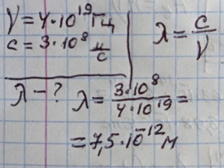 Визначити довжину електромагнітної хвилі у вакуумі , якщо вона поширюється з частотою ν=4∙10 -19 (Гц).