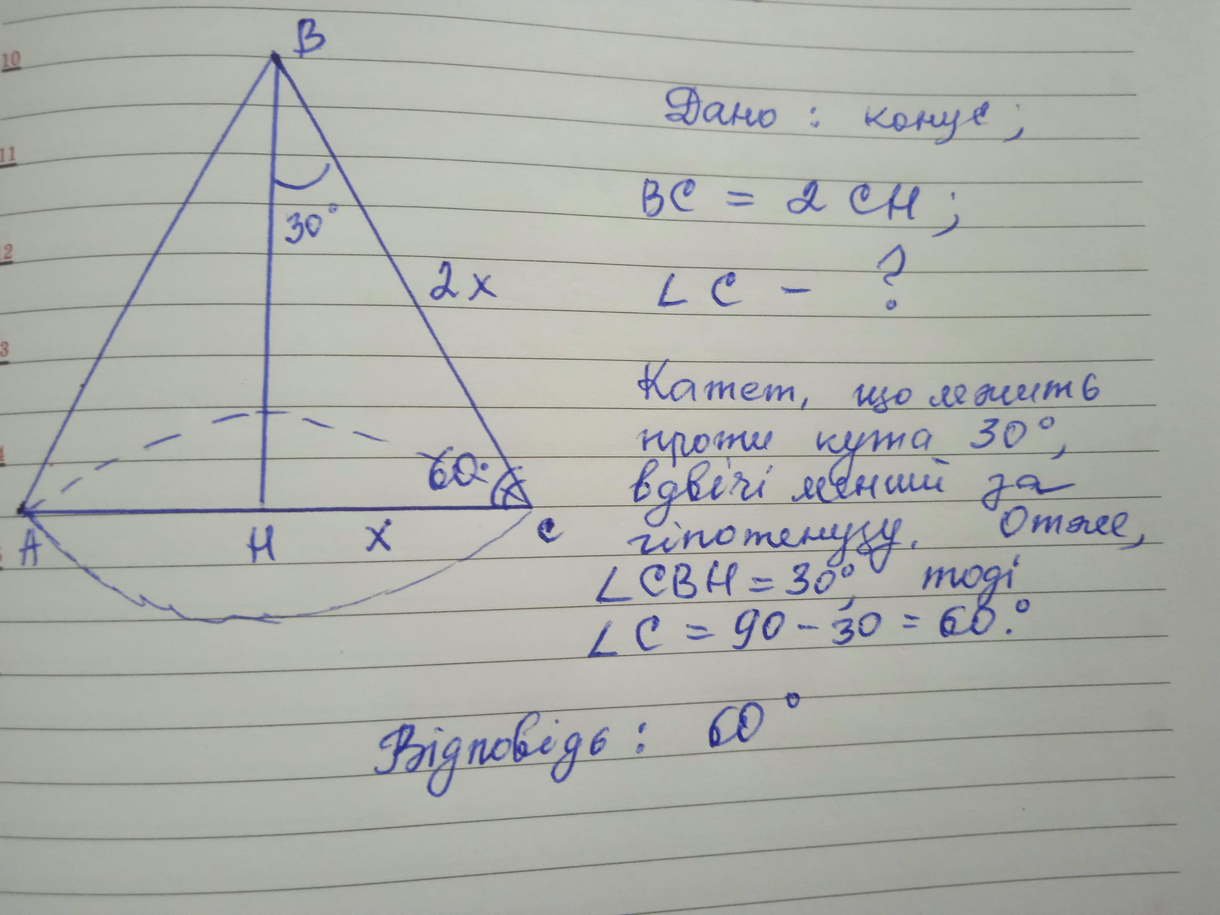 Твірна конуса у два рази більше його радіуса. Знайти кут нахилу твірної конуса