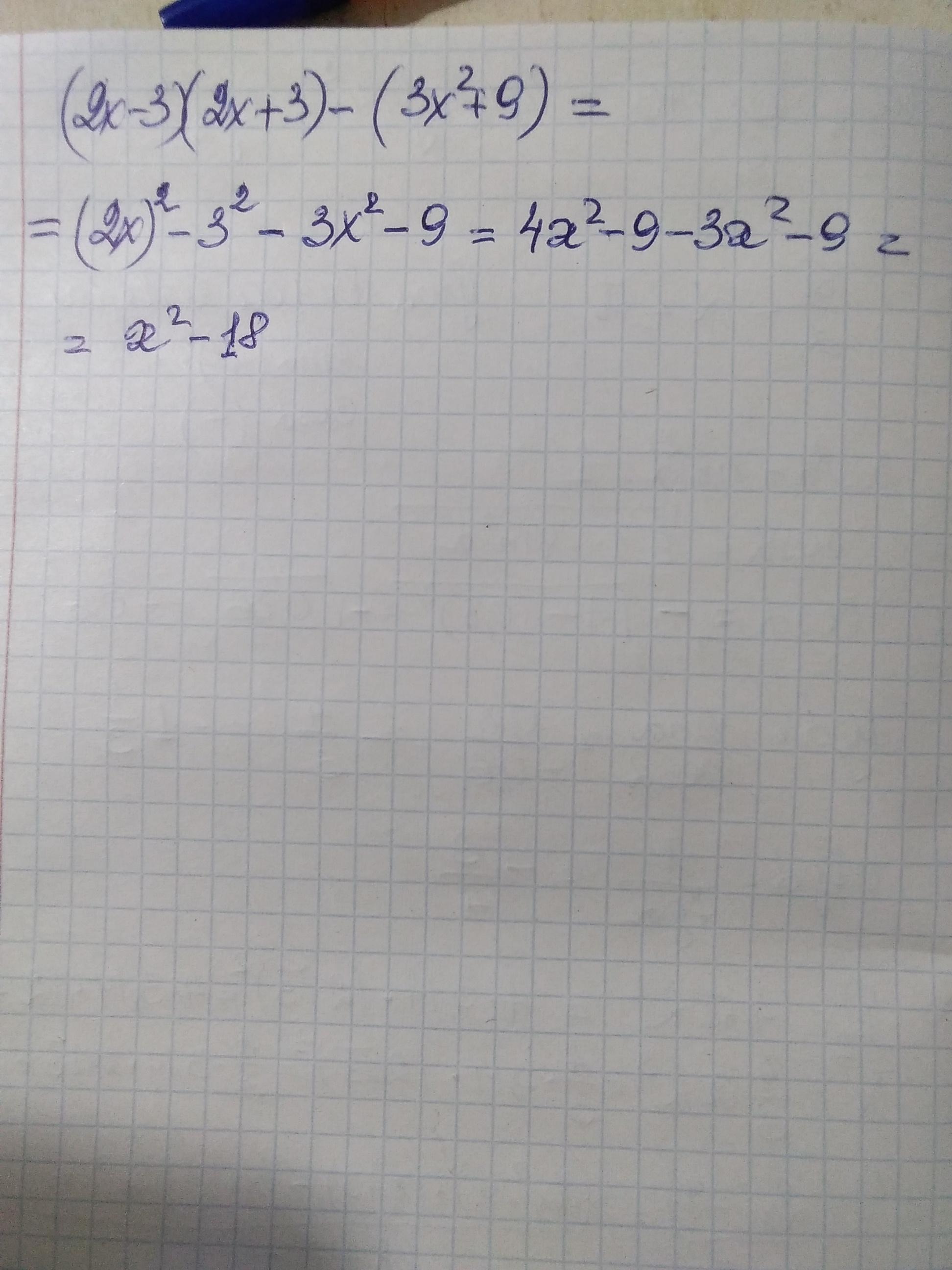 (2x-3) (2x+3) -(3x2+9) нужно упростить подробно... Подскажите?