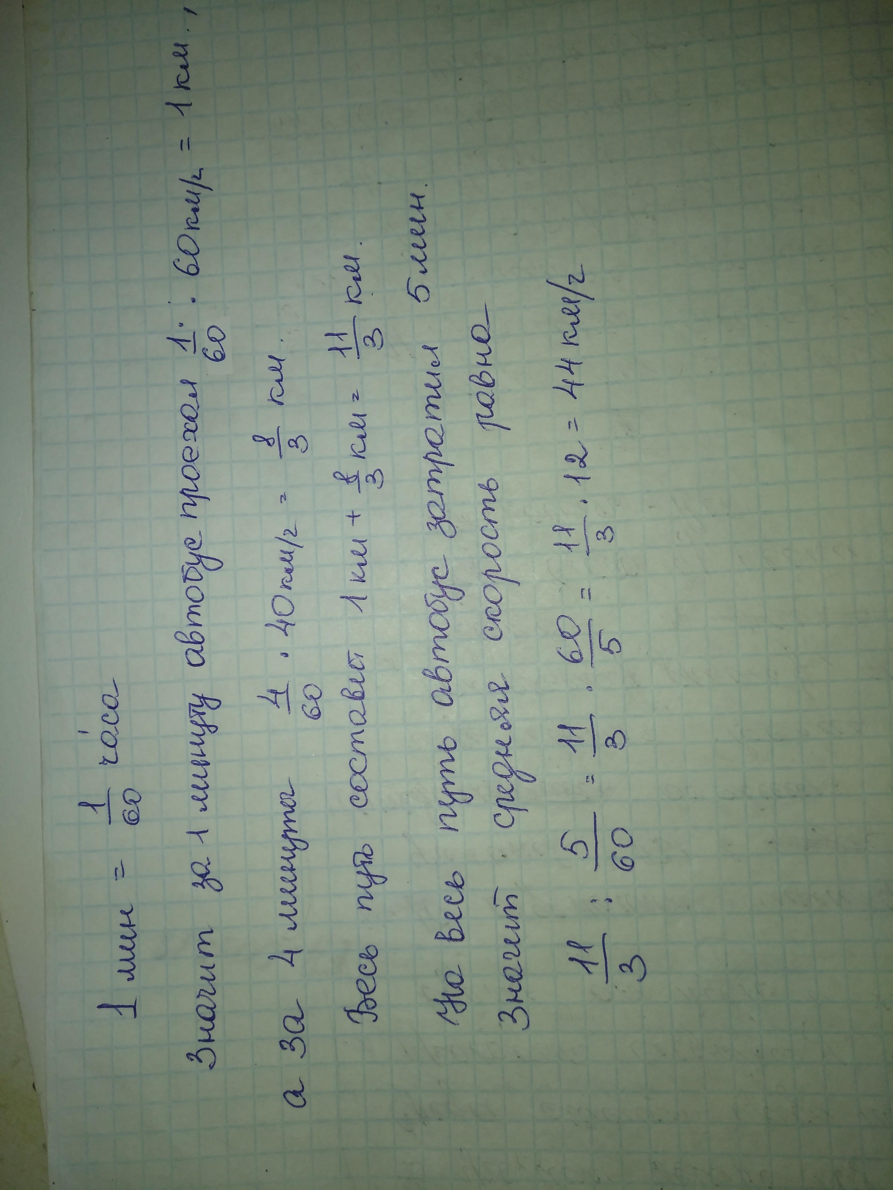 В течении времени 1 минуты автобус двигался со скоростью 60 км в час а затем в течении времени 4 минуты со скоростью 40 км в час. Определите среднюю скорость движения автобуса на всём пути.