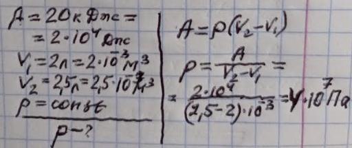 Під яким тиском перебував газ, якщо під час ізобарного нагрівання він виконав роботу 20 кДж, а об'єм збiльшився від 2 л до 2,5 л?