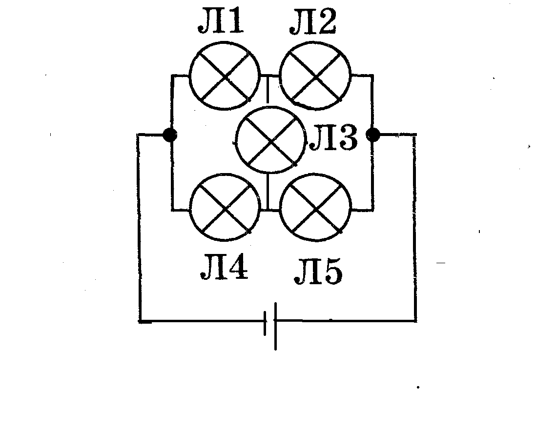Пять одинаковых лампочек соединены в цепь как показано на рисунке и подключены к батарее. Во сколько раз а изменится мощность, выделяющаяся в этой цепи, если лампочка номер 1 перегорит?