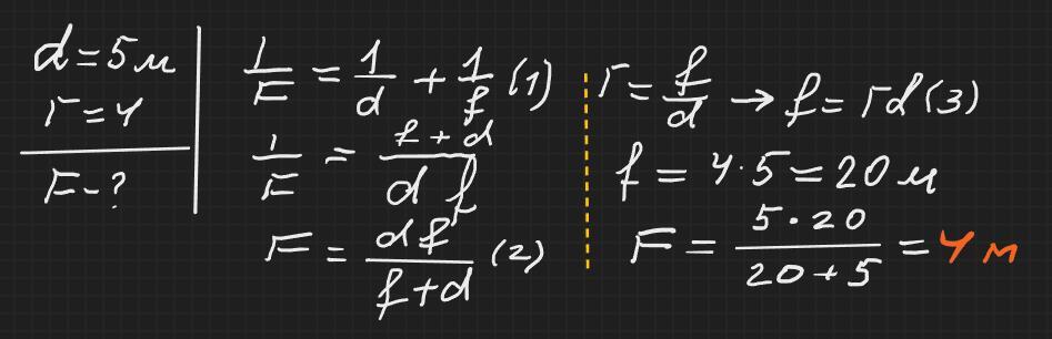 1. Відстань від предмета до екрана дорівнює 5 м. Визначте (у метрах) фокусну відстань лінзи, за допомогою якої на екрані буде отримано чітке зображення предмета, збільшене у 4 рази.