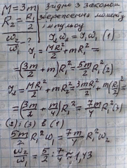 Платформа, що має форму суцільного однорідного диска, обертається за інерцією навколо нерухомоï вертикальноï осі. На краю платформи стоïть людина, маса якої в 3 рази менше маси платформи. Визначити, як і в скільки разів зміниться кутова швидкість обертання платформи, якщо людина перейде ближче до центра на відстань, що дорiвнює половині радіуса платформи. Вважати людину точковою масою.