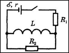 Какое количество теплоты выделится в резисторе R2 (см. рисунок) после размыкания ключа? ЭДС источника Е = 12 В, внутреннее сопротивление источника r = 1,5 Ом, индуктивность катушки L = 0,2 Гн, сопротивления резисторов R1 = 7,5 Ом и R2 = 3 Ом. Сопротивлением катушки можно пренебречь.