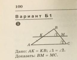 Розглянемо прямі КМ і АС та їх січну ВС . ∠1 = ∠2 - рівні відповідні кути за умовою , тому КМ║АС . АК = КВ , тому за Т.Фалеса ВМ = МС .