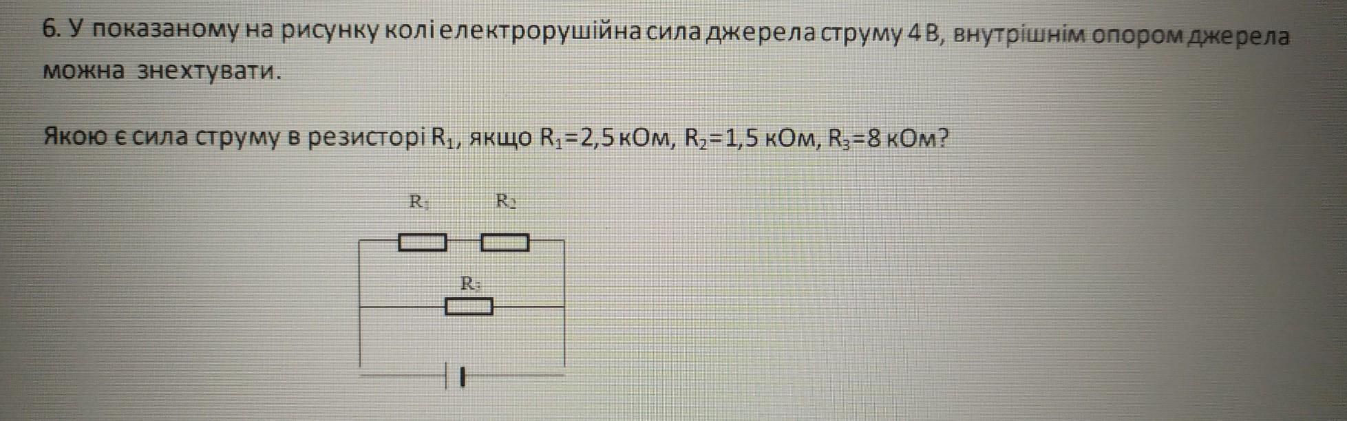 Якою є сила струму в резисторі R1, якщо R1=2,5 кОм, R2=1,5 кОм, R3=8 кОм?