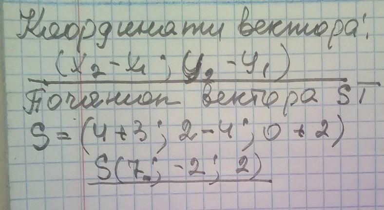 Знайдіть координати початку вектора ST (-3; 4; -2), якщо T (4; 2; 0)